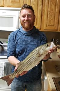 Showing off his first Texas Striped bass.
